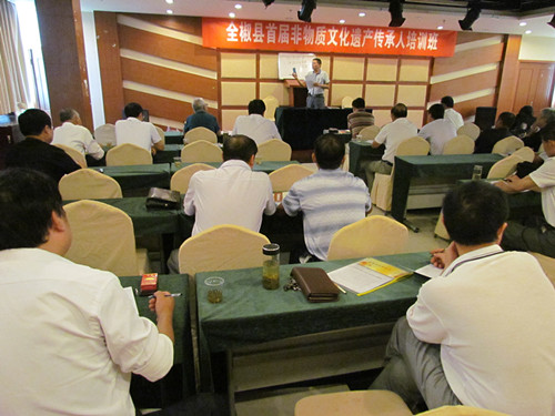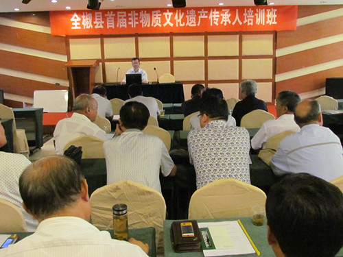 培训班上,县文广新局副局长罗林红作了动员讲话,强调了开班的意义;局长关敬文要求传承人珍惜这次学习机会,增强责任感和使命感,提升传承能力;县非遗保护中心主任王彦通报了我县非物质文化遗产保护工作启动以来的基本情况和工作成绩,并对我县非遗传承经费的发放作了详细说明;副主任鲁茂文讲解了什么是非遗传承人、非遗传承人的权利和义务;王开华老师介绍了《非遗法》出台的历史背景、重要意义、基本内容和精神实质;全椒民歌传承人孙翠阳、马厂酥笏牌传承人王玉昆等作了交流发言。